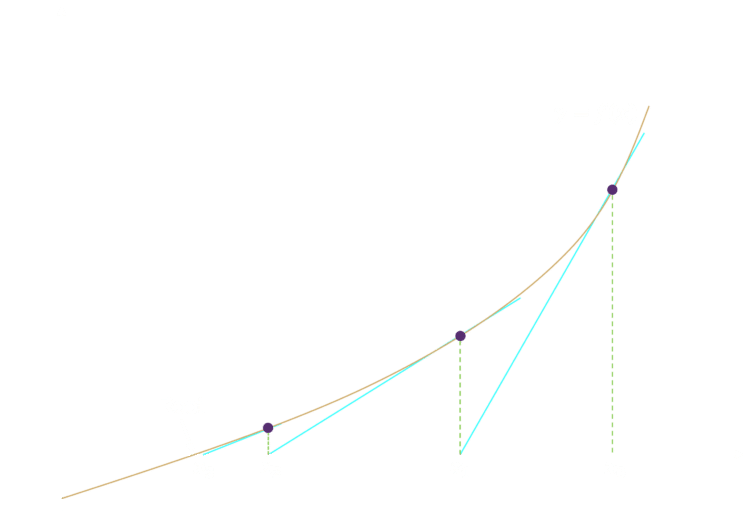 The Newton-Raphson method, visualized below, finds roots of a function by: