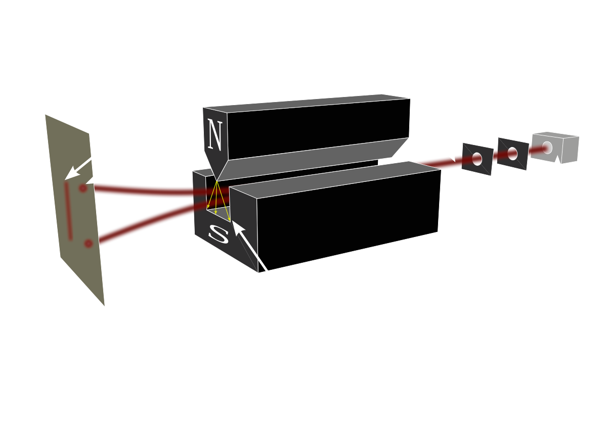 In the experiment setup pictured below, we have Silver (Ag) atoms coming out of a furnace (1). Silver atoms have 47 electrons, 46 of which form a spherically symmetric structure. This results in atoms with a magnetic moment equal to the electron spin of the 47th electron. As the atoms go through the magnetic field below, they would follow a path determined by their magnetic moment along the direction.