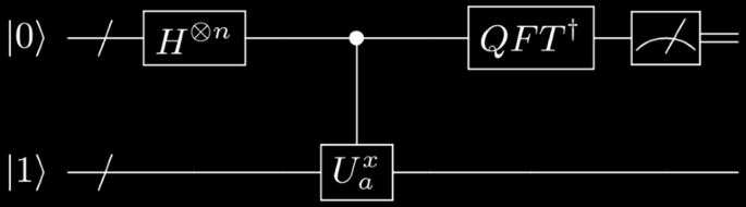 The circuit below represent’s Shor’s algorithm. It requires a composition of Hadamard gates, the CNOT gate, the Quantum Fourier Transform and